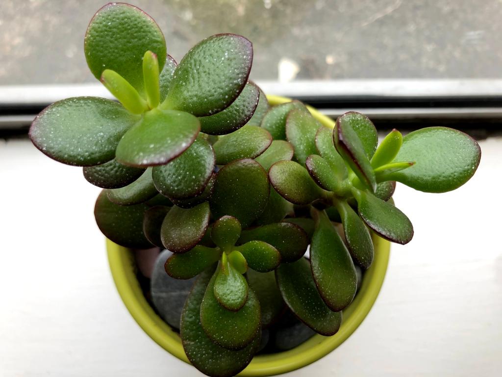 My jade plant, pictured above, is ever-so-slightly stressed; this comes from placing a plant either in too-strong or too-hot sun, cold, a lack of water, or both. It gets full sunlight for hours in the morning, so as it has flourished this summer, all the margins of the leaves have taken this lovely magenta hue, which comes from a protective compound called anthocyanin.